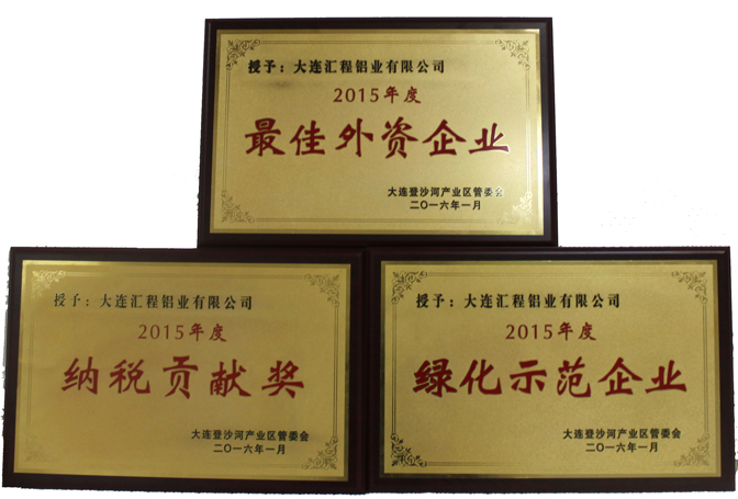 2016年1月15日,“关于表彰2015年度先进单位”的表彰大会,在大连登沙河产业区管委会隆重召开,大连汇程铝业有限公司荣获了 “纳税贡献奖”“最佳外资企业”“绿化示范企业”三个荣誉称号。